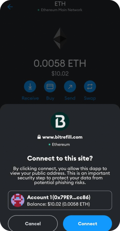 5. After clicking Metasmask wallet, you will see a prompt asking for your permission to allow Bitrefill to connect to your Metamask wallet. Click on connect to affirm the transaction.